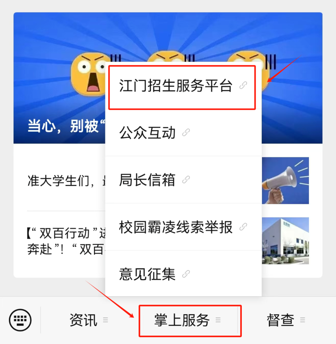 已报读江门市直、蓬江区、江海区、新会区、鹤山市民办小学、民办初中的学生家长可以在报名端查询录取结果和注册授权码,输入网址:http://jmzsbm.jiangmen.cn/进入“江门市中小学招生服务平台”,再选择进入“江门市民办小学报名”“江门市民办小升初报名”。或关注“江门教育”微信公众号,点击底部菜单栏“掌上服务-江门招生服务平台”进入报名端。